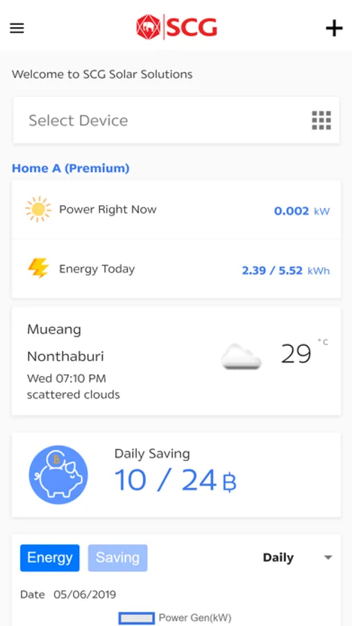 SCG Solar Solutions เป็นแอปพลิเคชั่นสำหรับรองรับลูกค้า ที่ไว้วางใจติดตั้งระบบโซลาร์รูฟท๊อปกับเรา ซึ่งจะช่วยให้สามารถเข้าถึงข้อมูลการผลิตไฟฟ้าจากระบบโซลาร์รูฟท๊อปและการประหยัดค่าไฟฟ้าแบบเรียลไทม์ รายวัน รายสัปดาห์ รายเดือน หรือรายปีได้ โดยง่ายผ่านสมาร์ทโฟนทั้งระบบปฏิบัติการ iOS