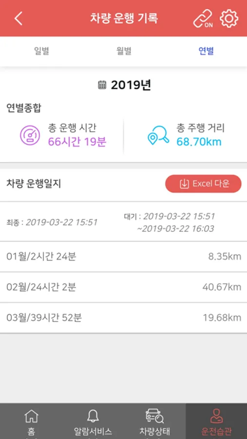 NB-IoT 동글을 통해 일별, 월별, 년별 주행 기록을 조회 할 수 있습니다.