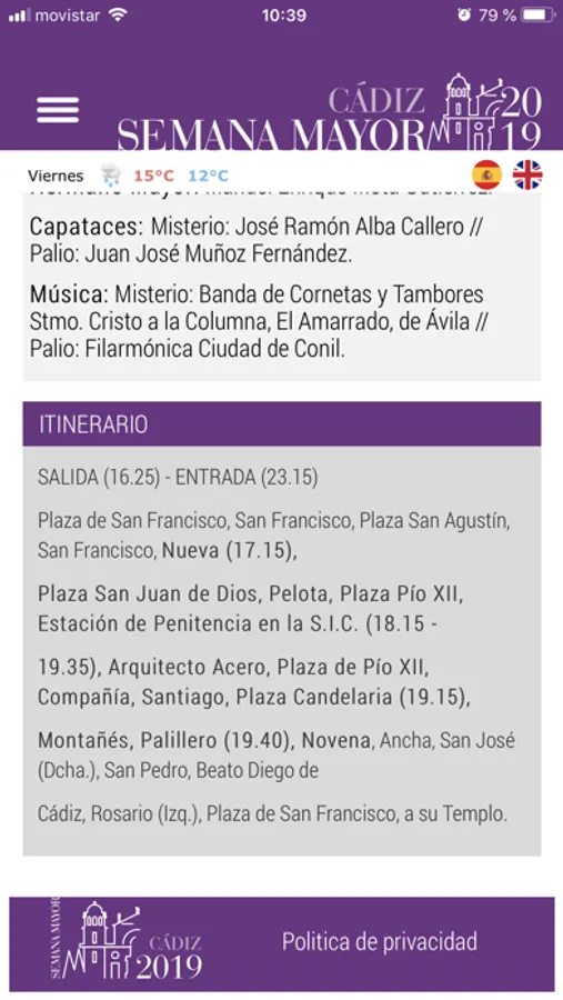 La aplicación incluye una información detallada de los horarios y los itinerarios de todas las Hermandades que procesionan en la Semana Santa de Cádiz ,los datos sobre la fundación de las mismas,su sede canónica y las bandas que las acompañan .
