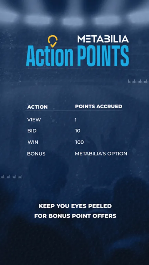 Earn Metabilia Action Points just by bidding in auctions, win or lose - redeem your points for memorabilia prizes, entry into exclusive giveaways, and access to play fun games.