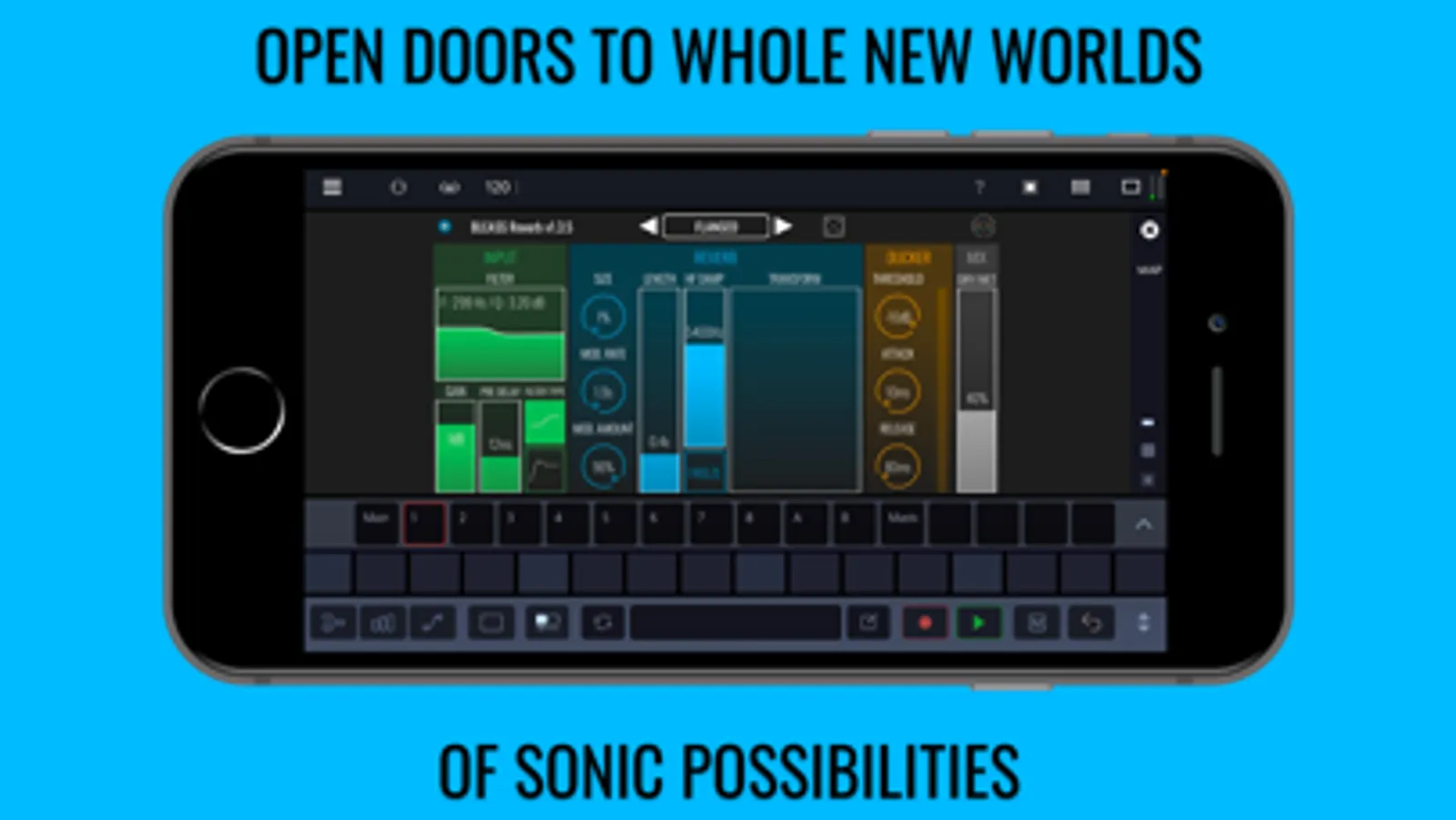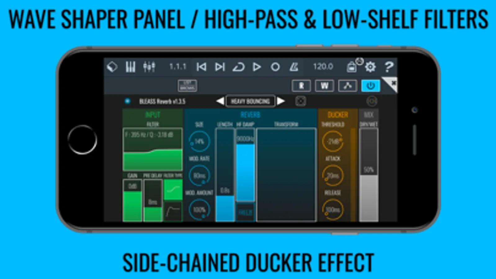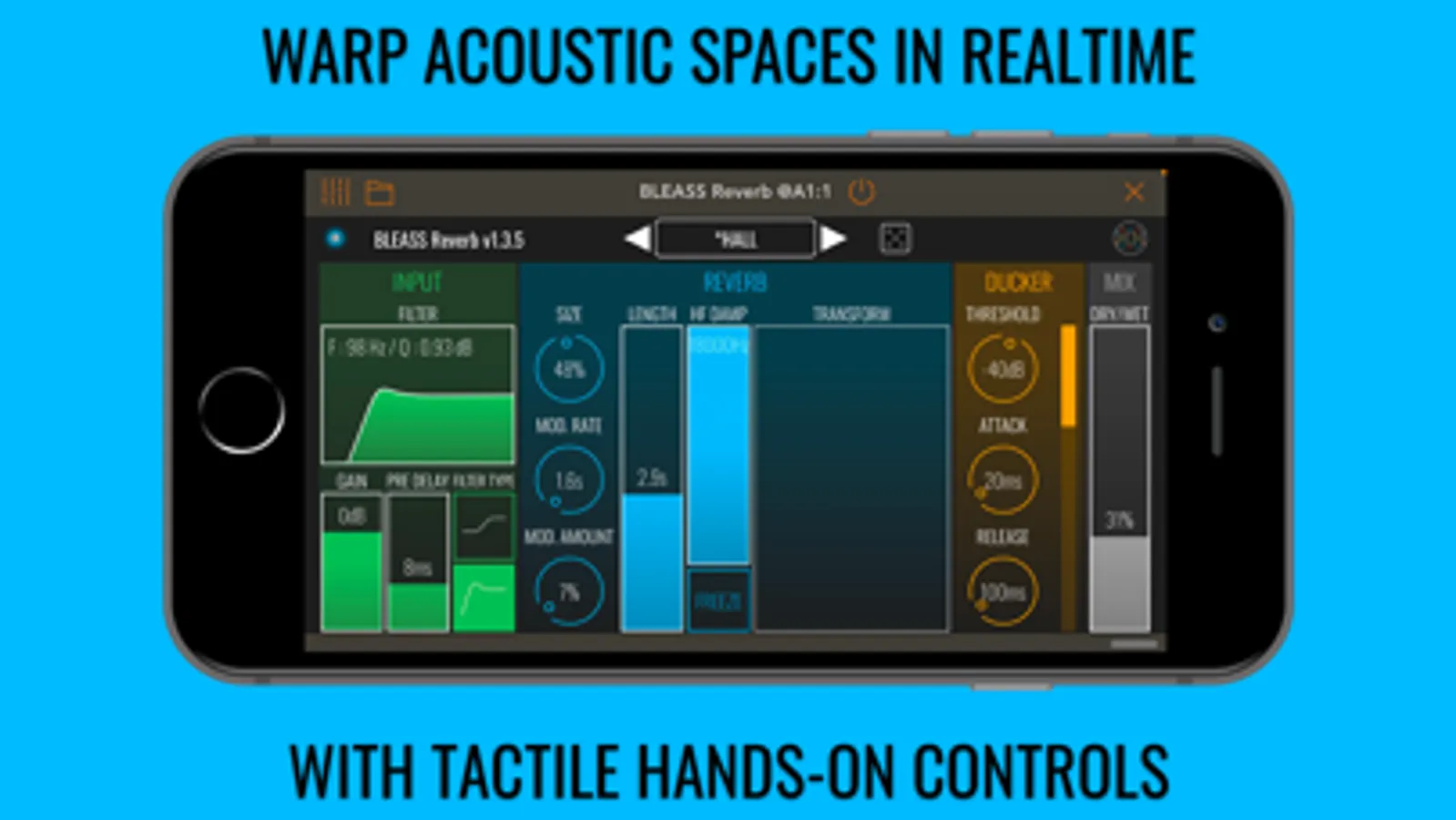 BLEASS Reverb’s clear, colourful and intuitive interface allows you to focus on the important details of your sound without overwhelming you with countless arcane options and settings. And nor will your iOS device be overwhelmed by BLEASS Reverb’s super-efficient engine.