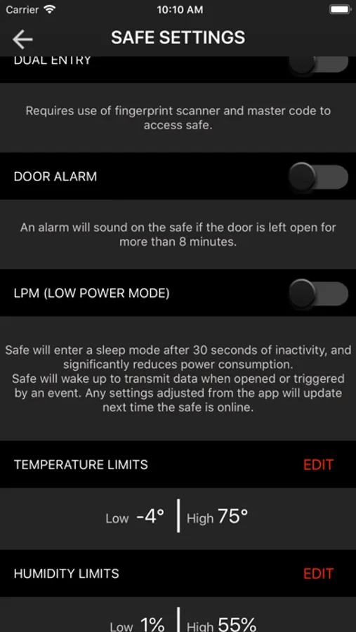 - Monitor temperature and humidity inside the safe (Support varies by safe)
