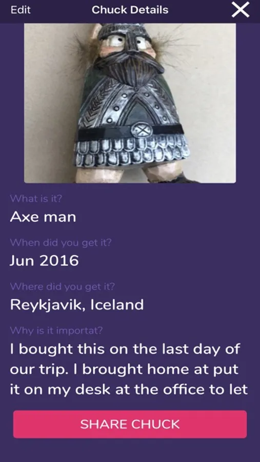 Chuck is that app that make it easy for you to let go of the physical stuff in your life - while preserving and sharing the stories. With Chuck, you can lose the “thing” without losing the more valuable thing - the story.