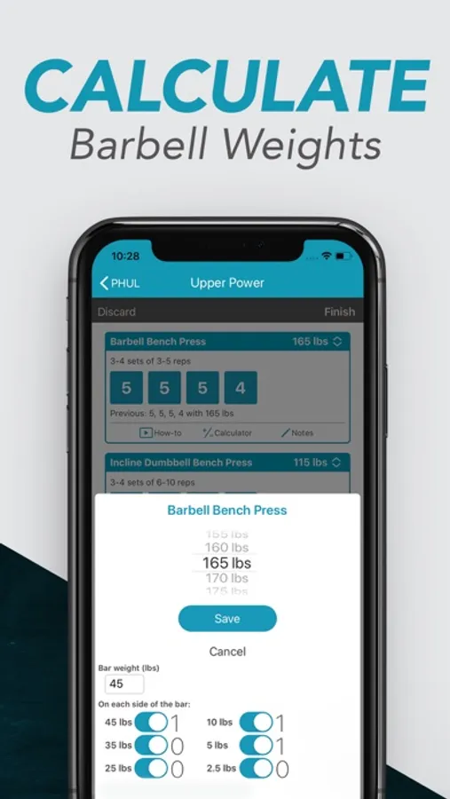 - Help you calculate weights with the built-in plate calculator