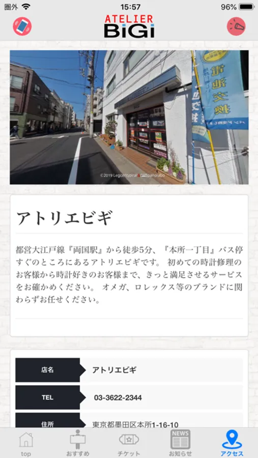アトリエビギアプリは、東京都墨田区本所にある時計修理専門店「アトリエビギ」の公式アプリです。