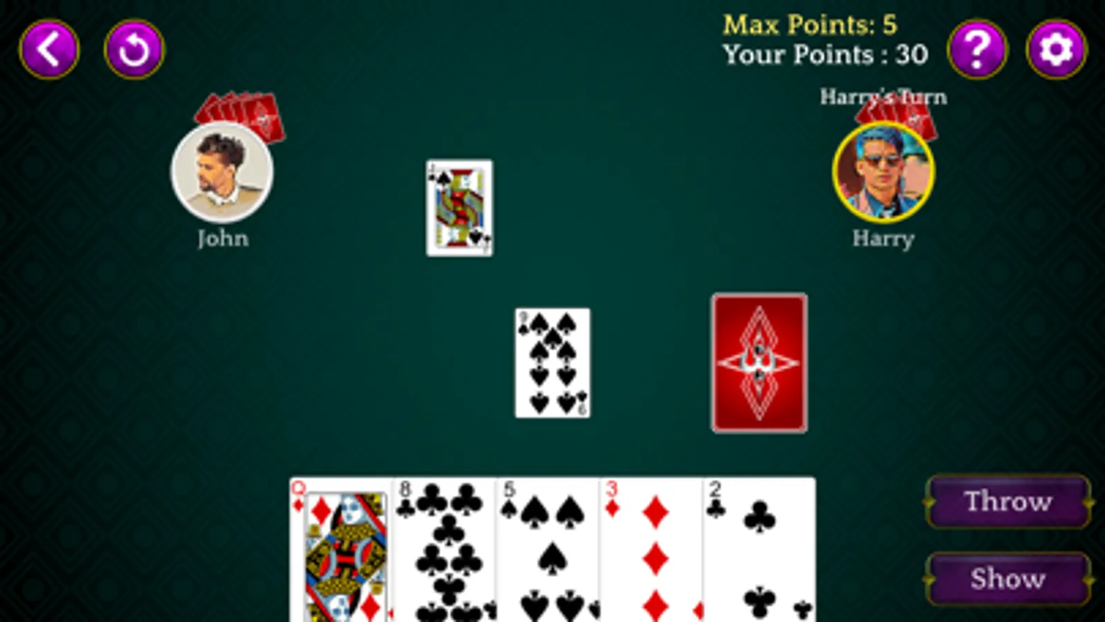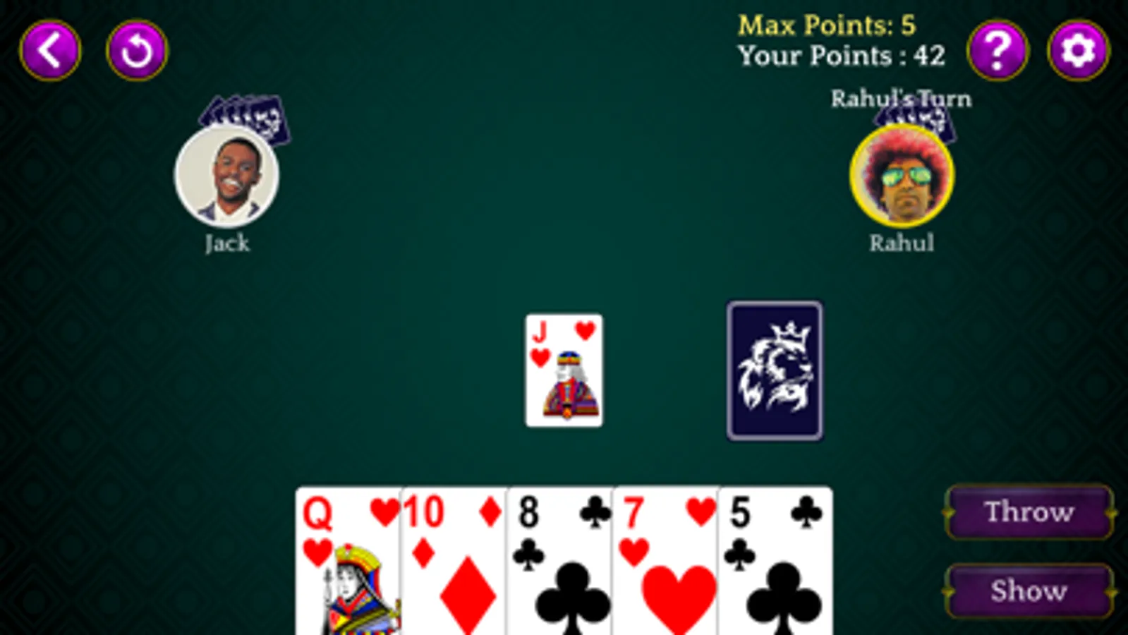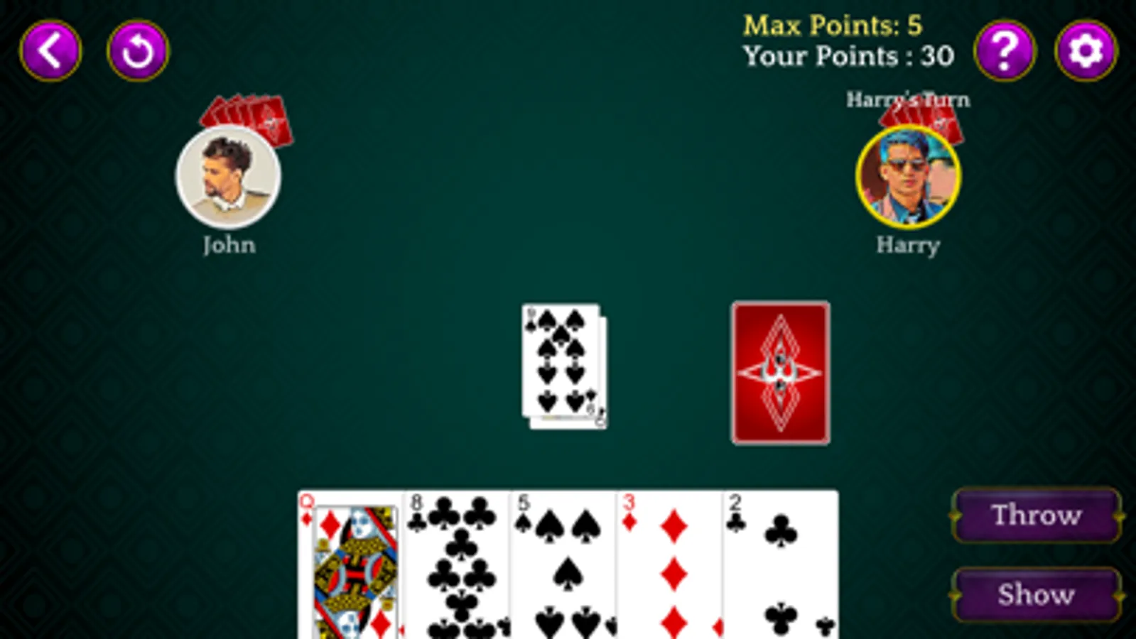 Dhumbal is a fun game played between 2 to 5 players with 5 cards distributed to each. The objective of Dhumbal game is to have lowest points among the players. You can throw a single card at a time or multiple cards a time if cards are a set or a pure sequence.