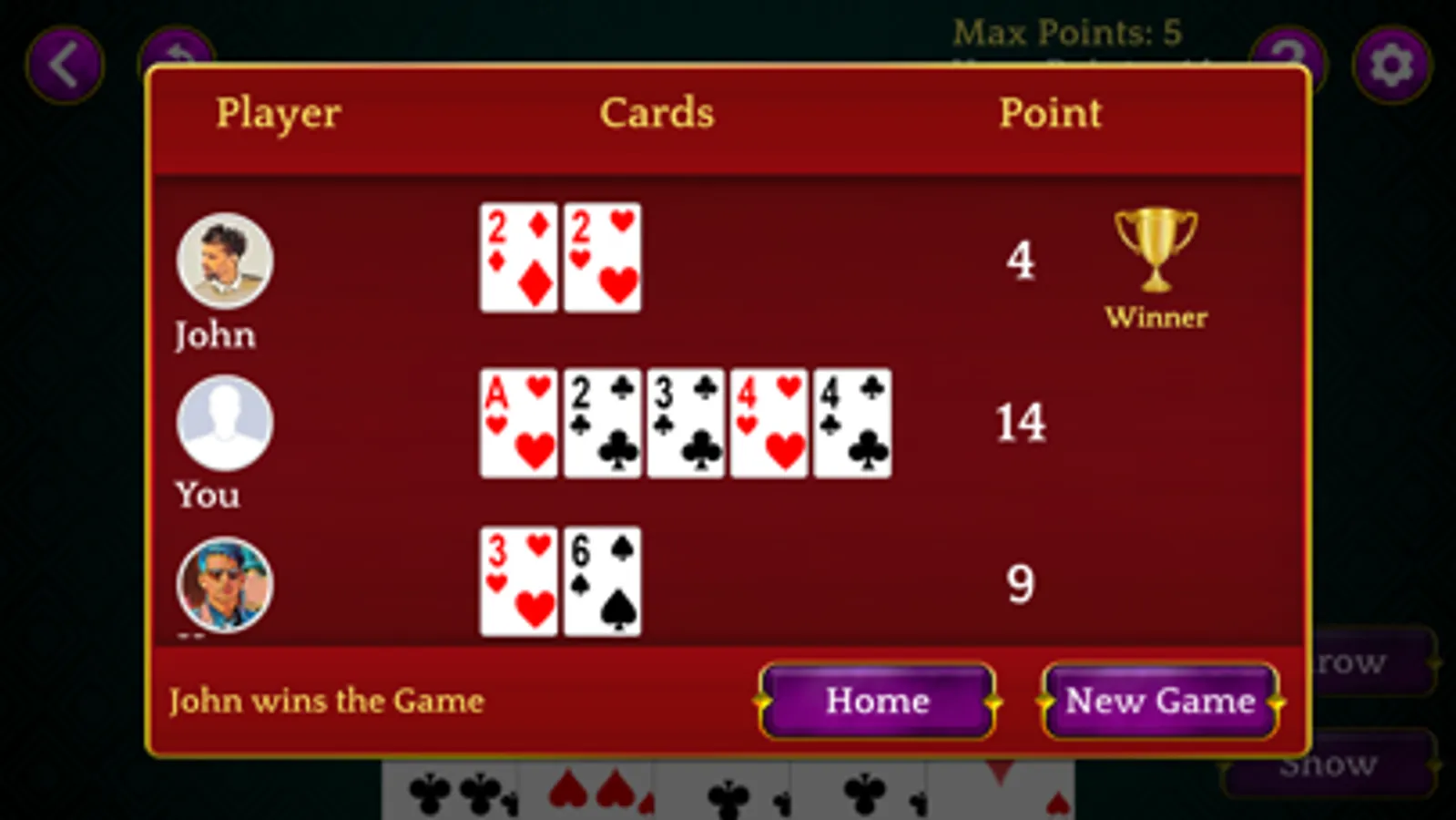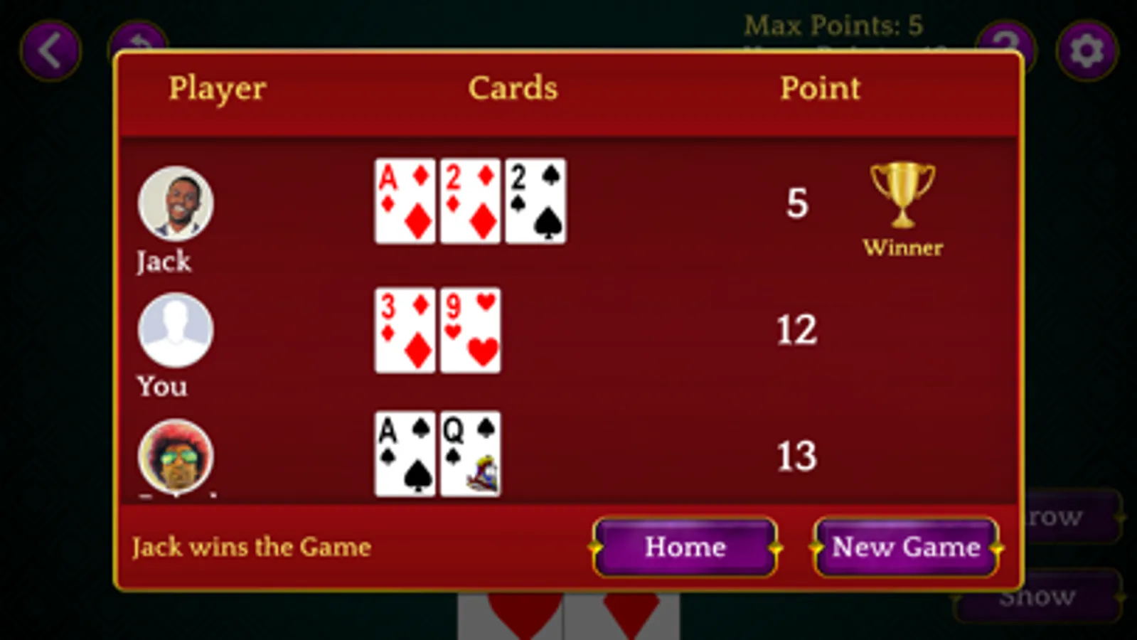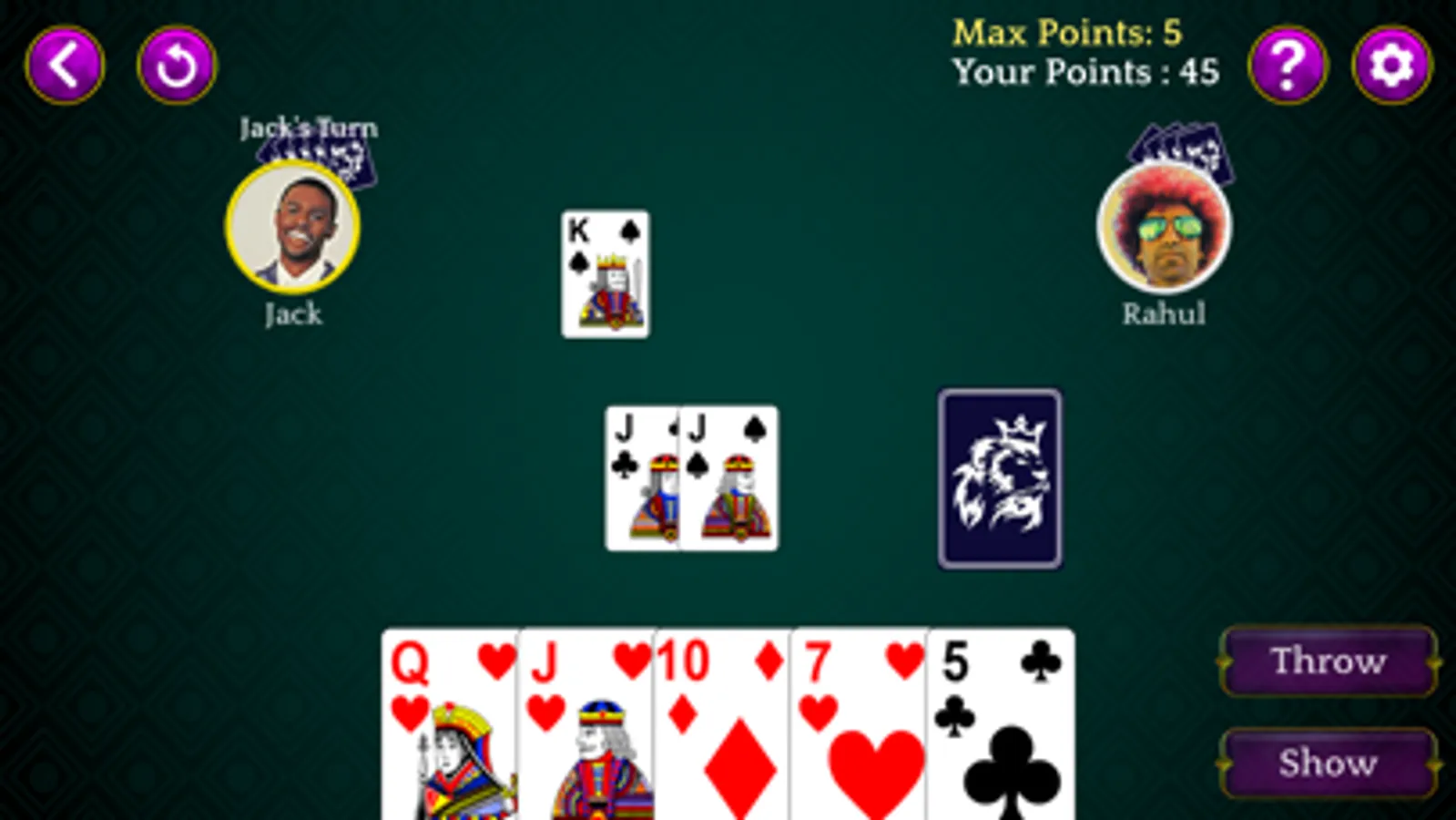 Dhumbal is a fun game played between 2 to 5 players with 5 cards distributed to each. The objective of Dhumbal game is to have lowest points among the players. You can throw a single card at a time or multiple cards a time if cards are a set or a pure sequence.