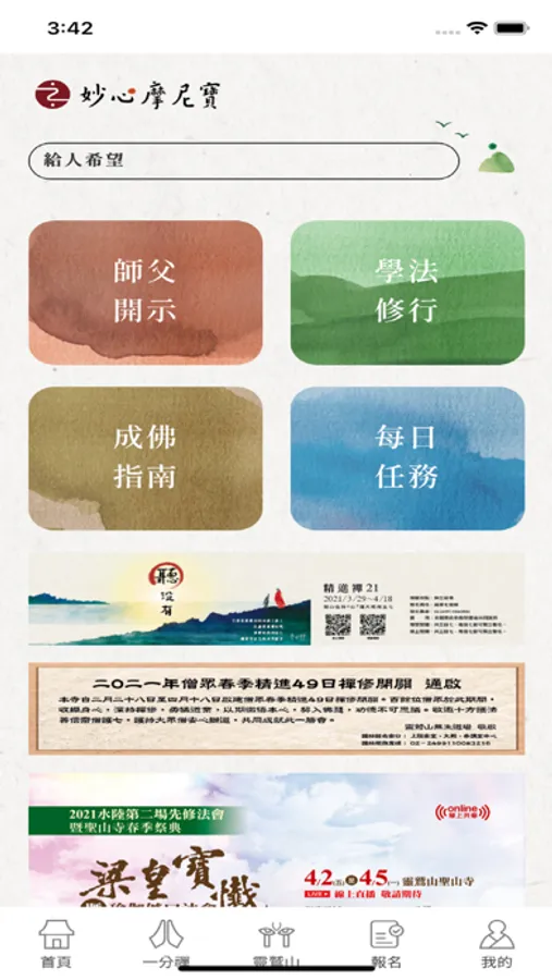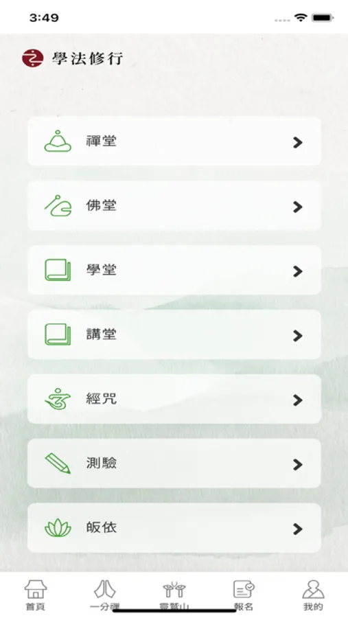 3. 學法修行:我們將散落各地的修學資訊整合起來,滿足您的精進行,包含:四期教育課程、心道師父禪修引導、早晚課誦、禮懺法會共修直播、經典電子書、線上皈依、線上測驗等精彩內容,隨時隨地即時學習。