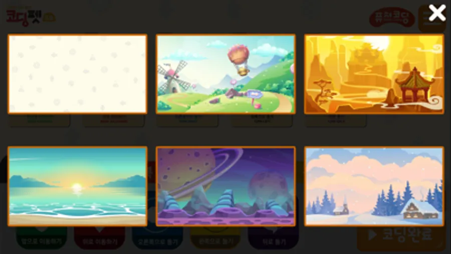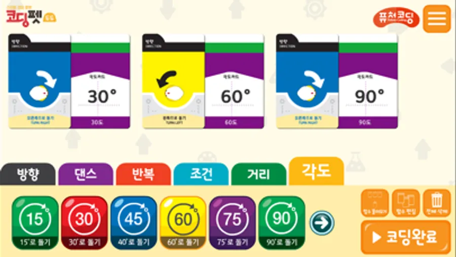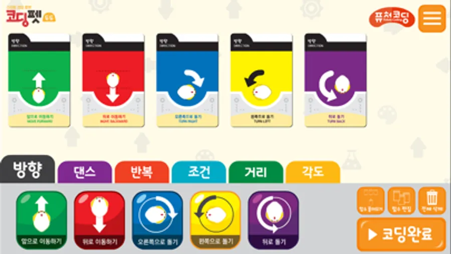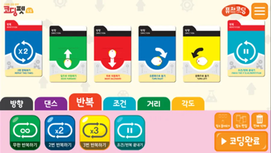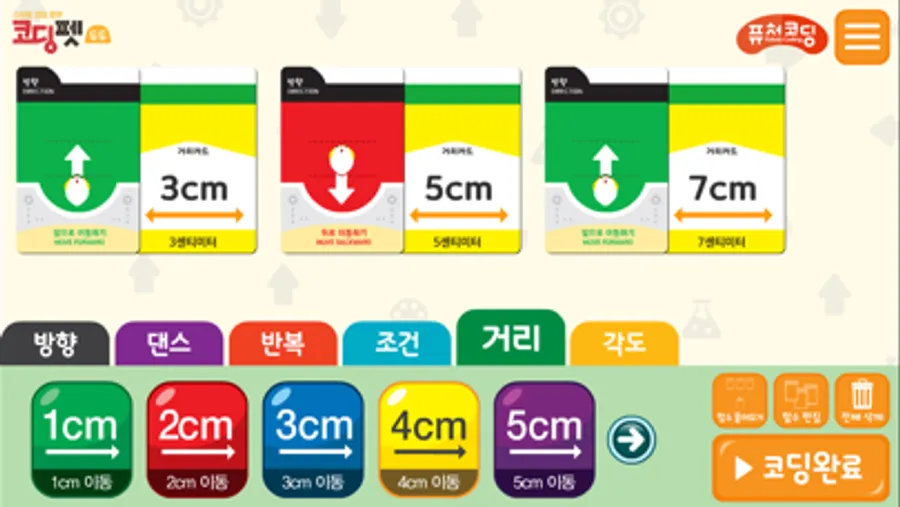 반복, 조건, 함수, 거리, 각도 카드를 활용해보세요.