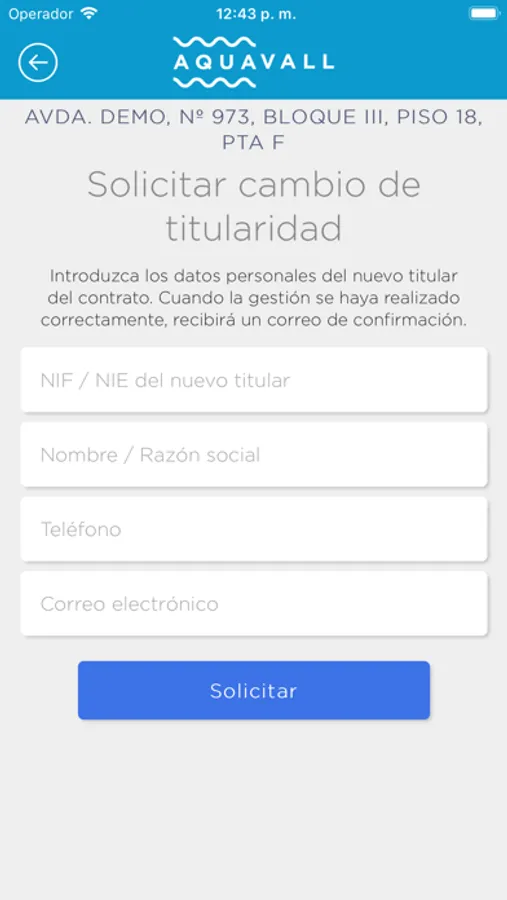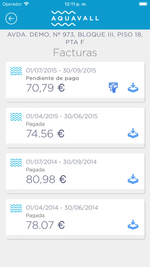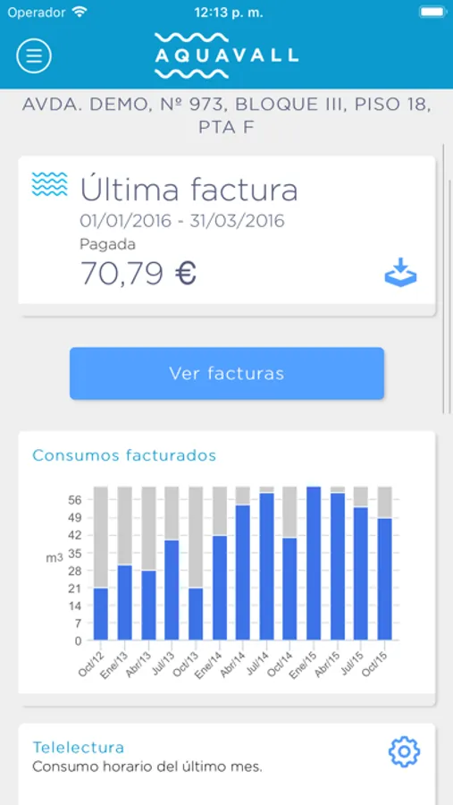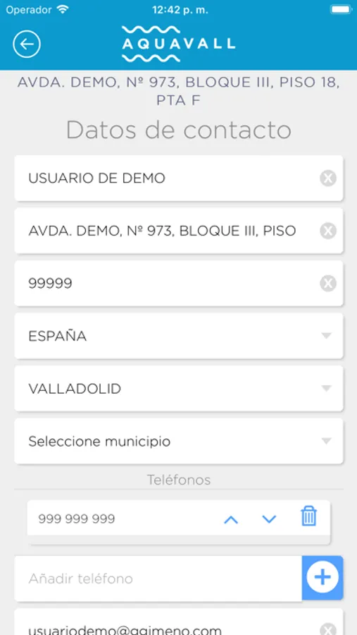 La app de la eOficina de AQUAVALL permite llevar a cabo las gestiones más habituales para cualquier usuario. Con esta aplicación podrá consultar sus contratos y consumos facturados, así como descargar y pagar sus facturas y modificar los datos de contacto y la domiciliación bancaria. También puede enviarnos la lectura de su contador y avisarnos en caso de detectar alguna avería en la vía pública.