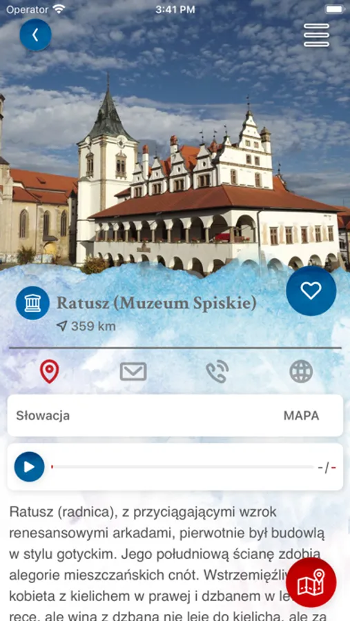 Aplikacja korzysta z usług lokalizacji w tle podczas działania funkcji audioprzewodnik. Aby oszczędzić zużycie baterii wyłącz audioprzewodnik przez wyjściem z aplikacji.