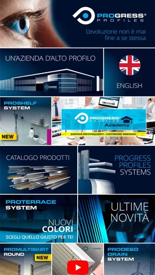 Leading company in the production, design and marketing of profiles for interior decoration, Progress Profiles is in continuous evolution exporting in more than 50 countries. It is an example of cutting-edge entrepreneurship with more than 30 years of success in the international market, a steadily increasing turnover, a solid business context and the certification ISO 9000. As of today it boasts over 60 employees and over 100 collaborators. Thanks to its significant investments in the research and the development of the most advanced technologies and materials, its new premises of 25.000 mq, its network of over 120 high-profile national and international agents and its three branches abroad, Progress Profiles promotes the 100% made in Italy quality of its products.