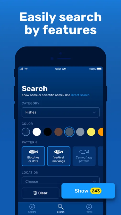 • Search by color, pattern, location, body shape, social behaviour, tail fin shape, etc.