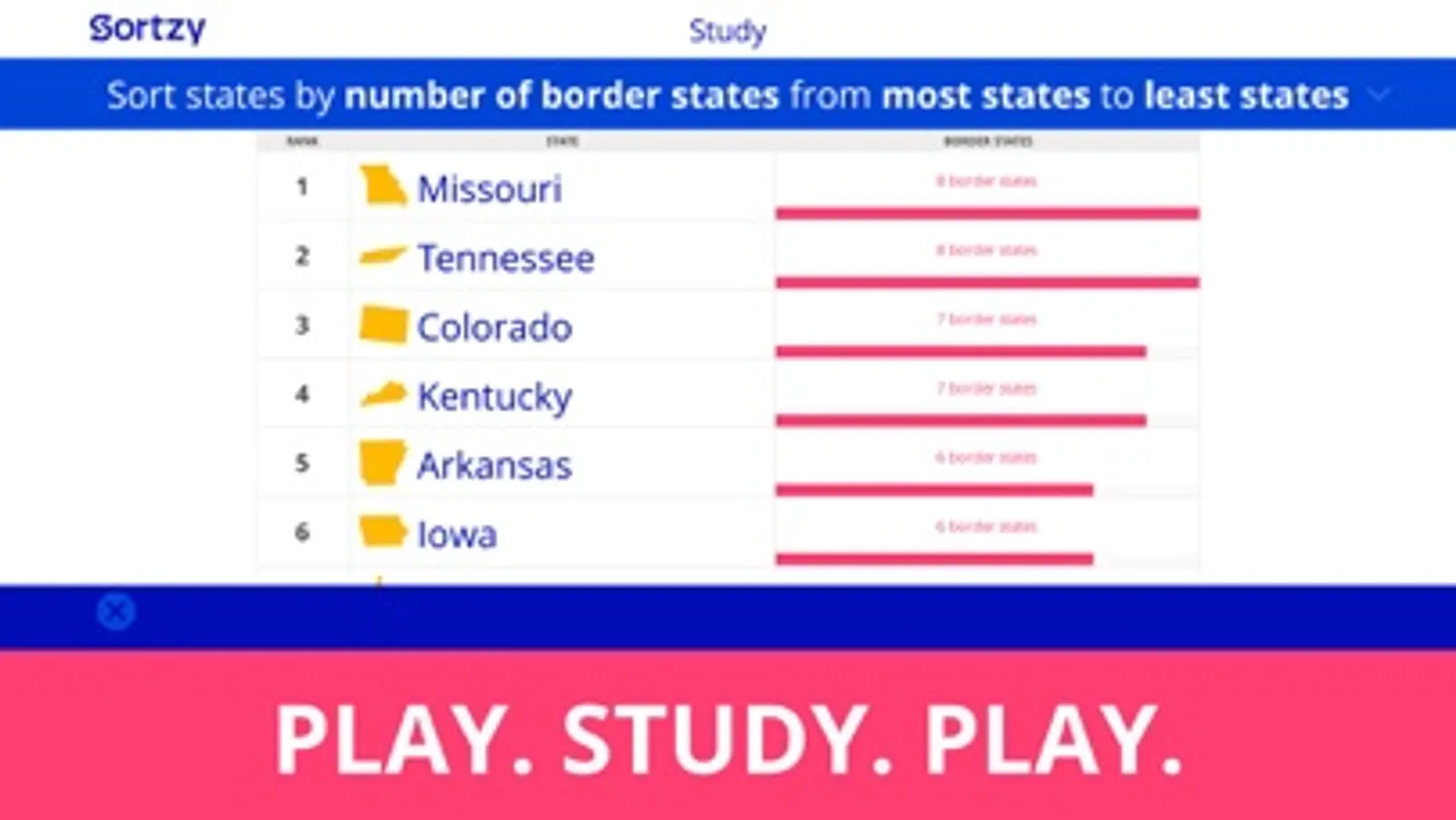 Sortzy States begins with basic geography and demographic information and builds from there. Unlock each region of the United States by answering comparative trivia questions, and see if you can master all 50 states to BOSS Level.