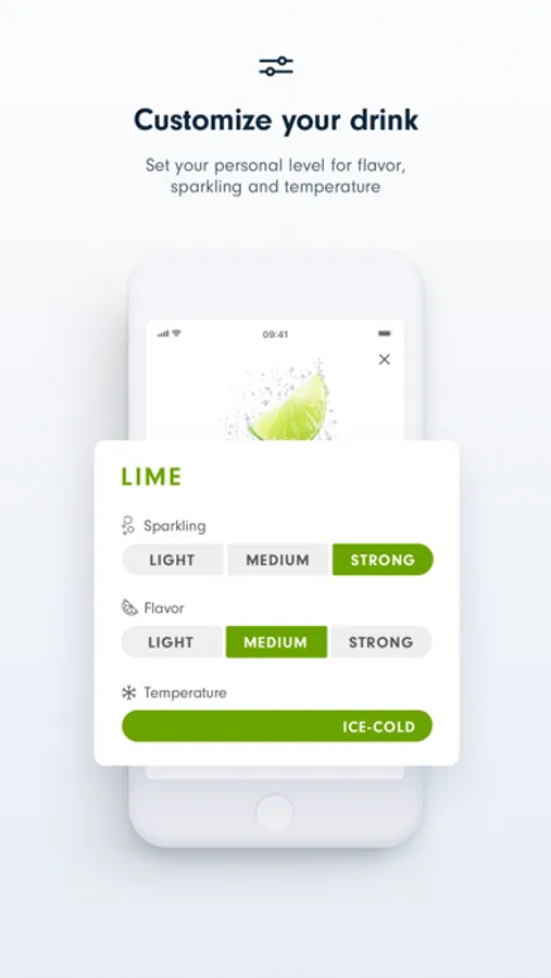Adjust your preferred levels for flavor, sparkling, and temperature.