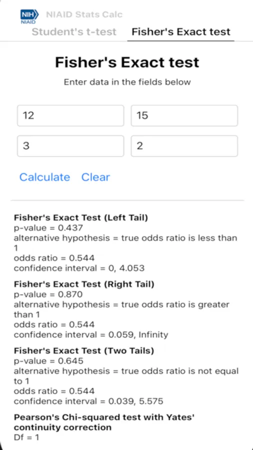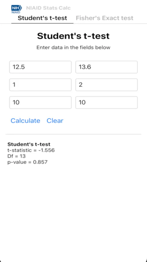 The NIAID Stats Calculator is provided by the National Institute of Allergy and Infectious Diseases, part of the National Institutes of Health. The calculator performs quick sanity checks when exploring experimental results data using either the Student's t-test or the Fisher's Exact Test for two categories. Instead of requiring the user to input large sets of raw data, the NIAID Stats Calculator is designed to run the tests using the mean, standard deviation, and sample size of the groups.