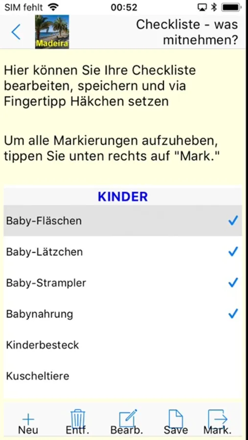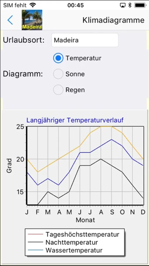 Die Madeira App enthält u.a. Reise-Checklisten für Ihre Reiseapotheke und Ihr Urlaubsgepäck, welche Sie auch selber verfeinern und im nächsten Urlaub wieder benutzen können. Außerdem bietet sie ein Reistagebuch und Wetterstatistiken mit schönen Diagrammen z.B. zum Klimavergleich zweier Urlaubsorte. Weiterhin ist eine kleine Diashow und eine Sammlung von relevanten Webseiten für die Region vorhanden und gibt Ihnen die Möglichkeit, alle Informationen, die für Ihren Aufenthalt auf Madeira oder für Sie als Fan von Madeira interessant sind, möglichst bequem im Internet abzurufen: