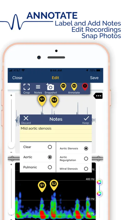 * The phonocardiogram can be annotated with S1, S2, and ! markers to call out areas of concern