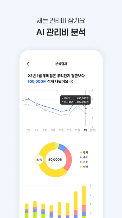 내가 내는 관리비가 작년 이맘때보다 적게 나왔는지, 같은 평수 다른 집보다 많이 내고 있는 건 아닌지 한눈에 볼 수 있어요.