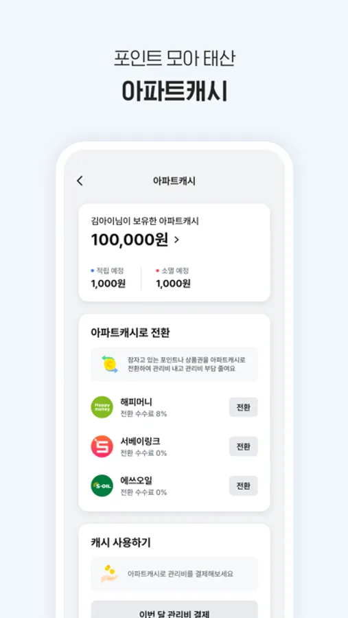 네이버페이, 토스, SSGPAY로 간편한 관리비 납부는 물론, 제휴사 포인트를 아파트캐쉬로 바꾸거나 다양한 이벤트에 참여해 관리비를 할인 받고 결제할 수 있어요.