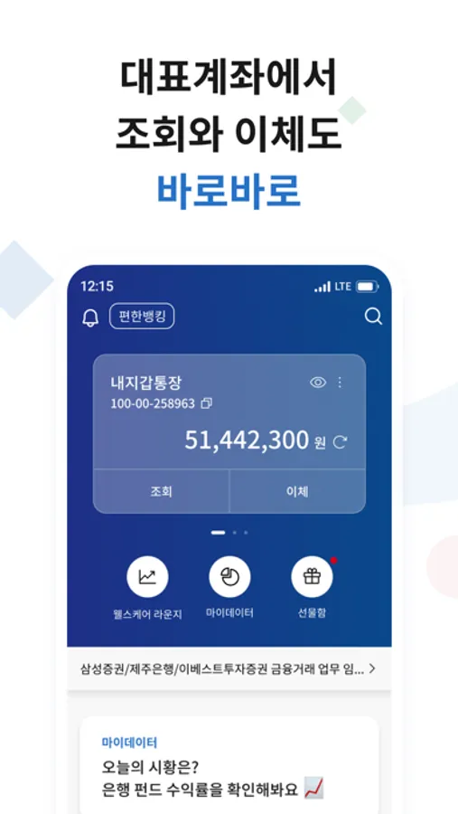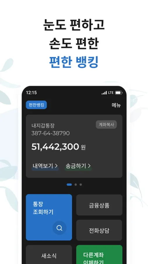 - 이체: 계좌번호를 몰라도 전화번호로 간편하게 이체 하세요.