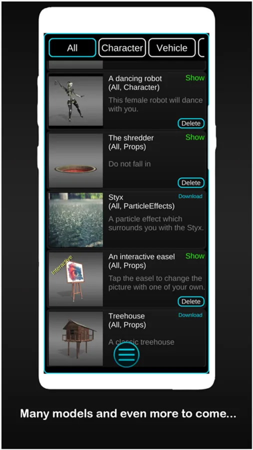 AR Stage allows you to experience different 3D models in Augmented Reality. You can embed the models in your environment and share video or pictures with friends.
