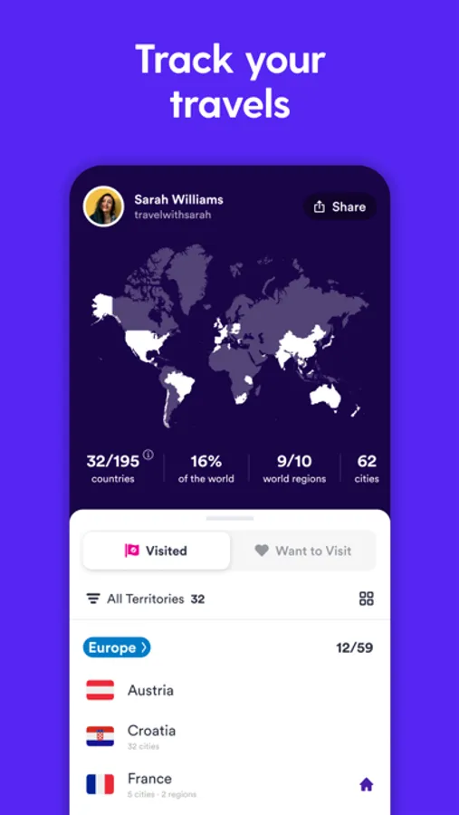 See your travel stats by world region and share your scratch map with friends