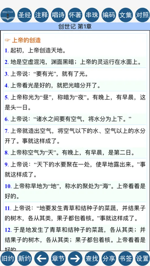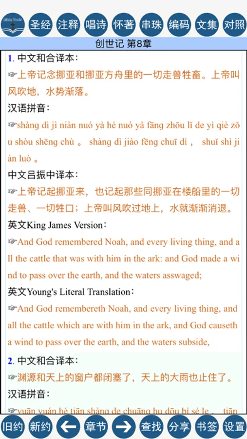 点击经文前的数字序号,你可以快速定位到其它栏目,如从和合本圣经定位到圣经注释等。