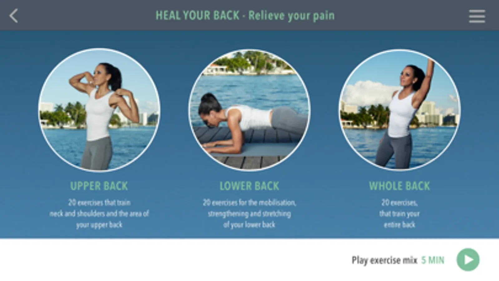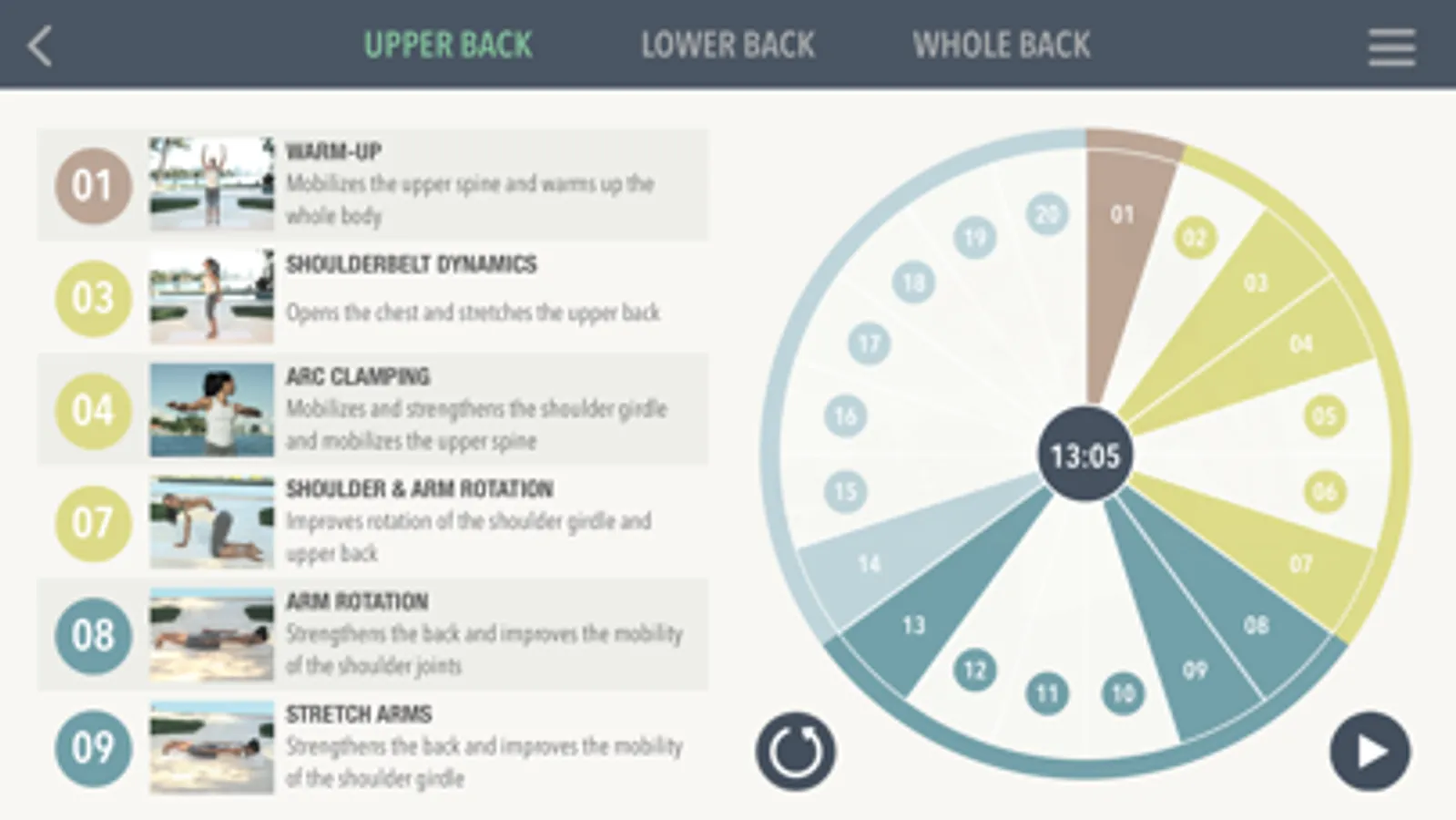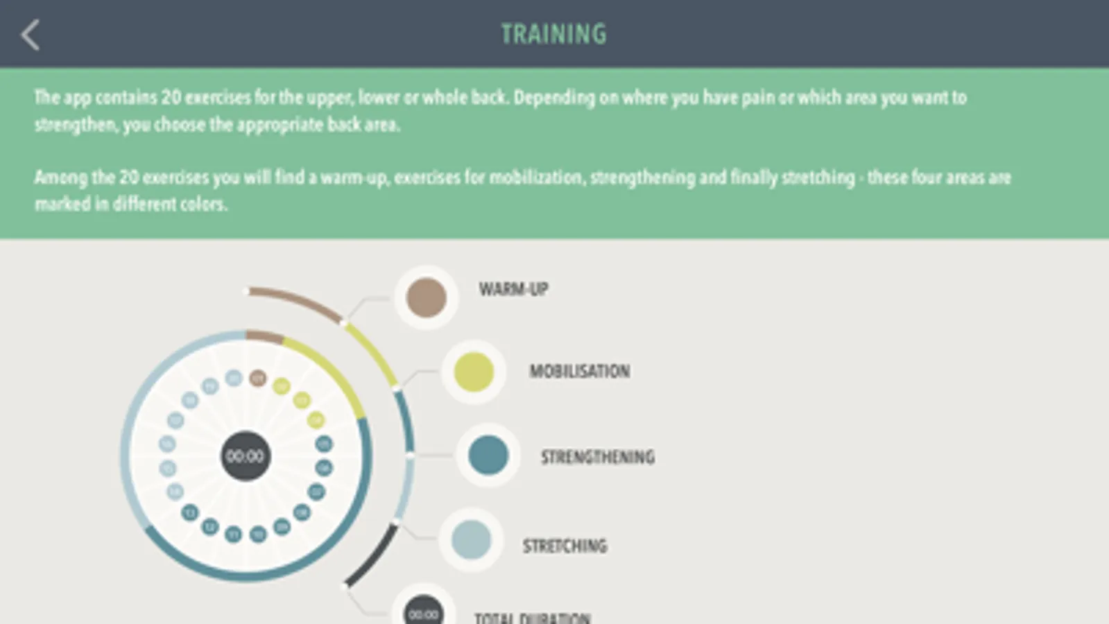 * The app contains 20 exercises each for the upper, lower or entire back - depending on where you have pain or which area you want to strengthen. Simply select the appropriate back area that needs to be fortified.