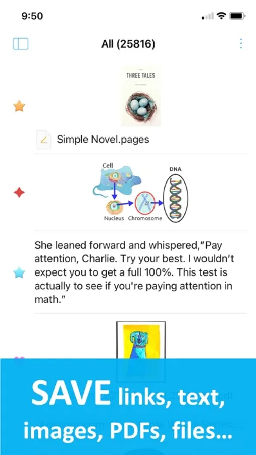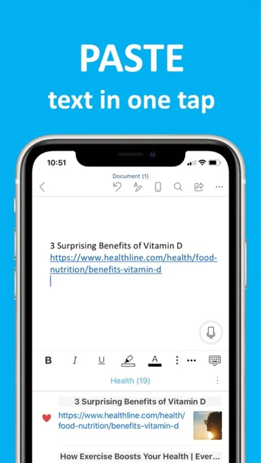 Capture favorite things quickly before losing them. Save web links, text snippets, images, PDFs, photos, videos, color codes, important clipboard (copied) data, and other items. Also scan documents, take quick notes, draw pictures, take photos, and even paste often-used text into documents without retyping them -- via a custom keyboard!