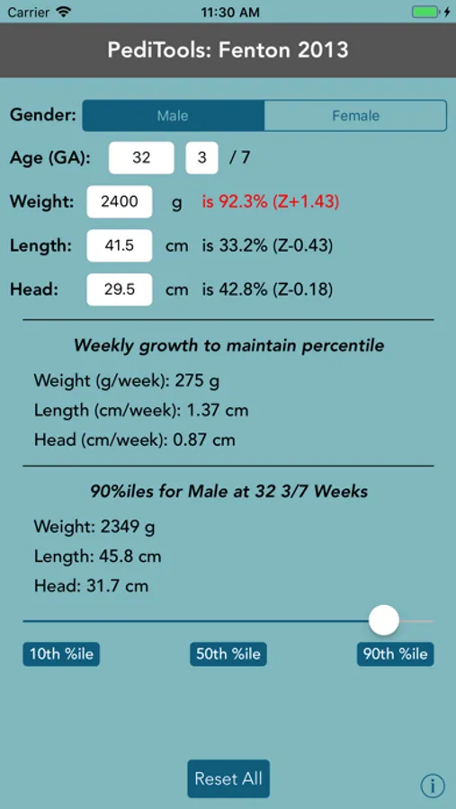 • convenient buttons to display 10th, 50th, and 90th percentile measurements