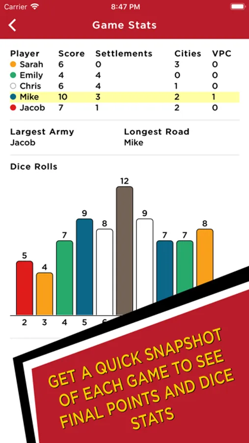 - Game stats (including total points, dice rolled, resources distributed, etc. etc.)