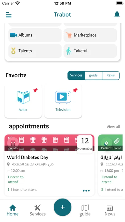 The application services are divided into only two parts. First, social services are (weddings - visiting a patient - occasions - deaths and condolences - know your neighbor - coordinating events - pictures and videos - home home products - talents - solidarity - delicacy - news)