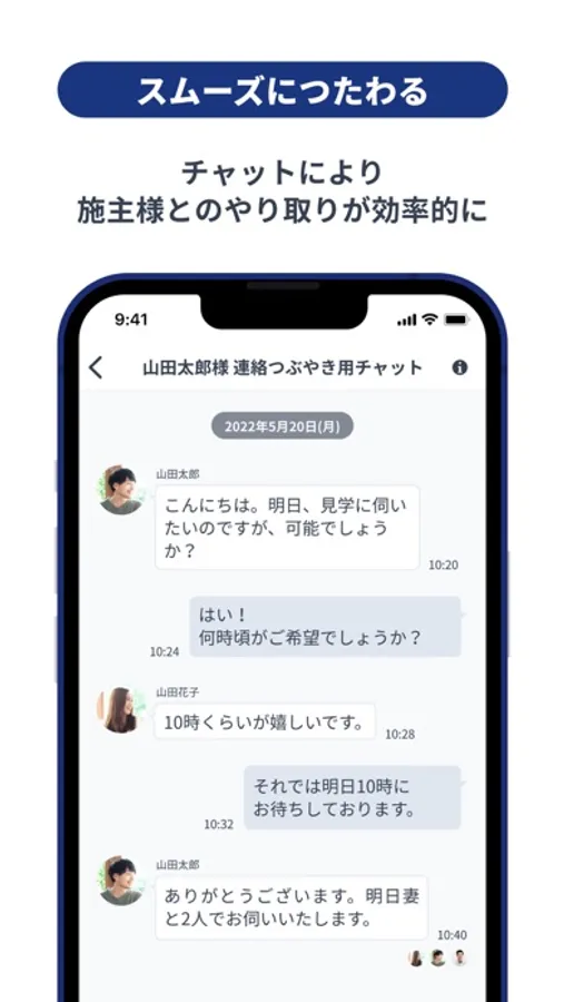 マイホムでは、お客様とのやりとりがそのまま社内で共有できるので、「共有するための仕事」のほとんどを削減できます。次工程への引き継ぎだけではなく、最終工程までの引き継ぎを、ほとんど不要にすることができます。