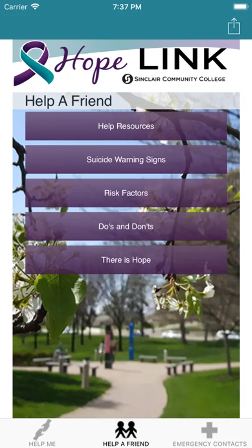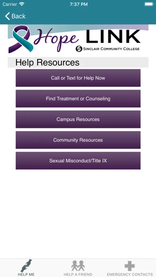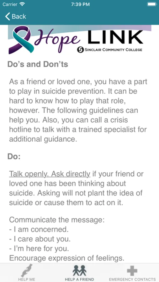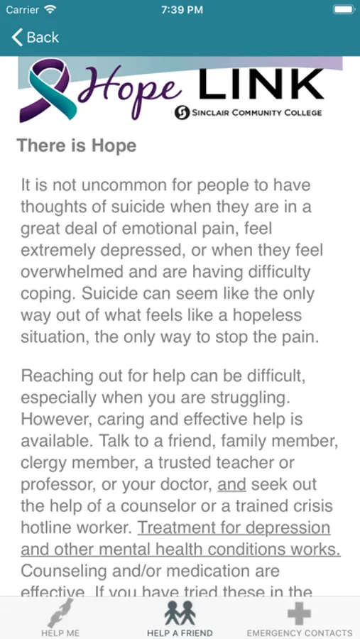 Sinclair’s Hope Link app provides guidance for supporting a friend in need, suicide prevention, or coping with mental health challenges. With the “My Support Network” function, users can create a customized collection of just those contacts they especially want to quickly access and reach out to by phone or text during difficult times. Hope Link also provides easy and centralized access to potentially life-saving resources and services offered on campus and in the community, including crisis hotlines. The Hope Link app is designed for students, parents, friends of students, faculty and staff of Sinclair College, located in Dayton, Ohio. The Hope Link app better prepares people to help a friend, loved one or themselves.