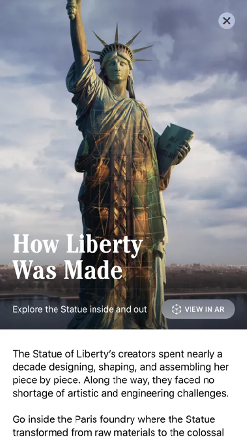 The Statue of Liberty is more than a monument. She is a symbol of freedom to millions around the world. This app uses Augmented Reality and immersive storytelling to bring the Statue to life anywhere. Now you can experience the iconic monument from wherever you are.