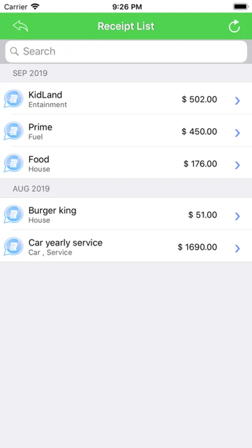 - Show list of stored receipts, filter and search