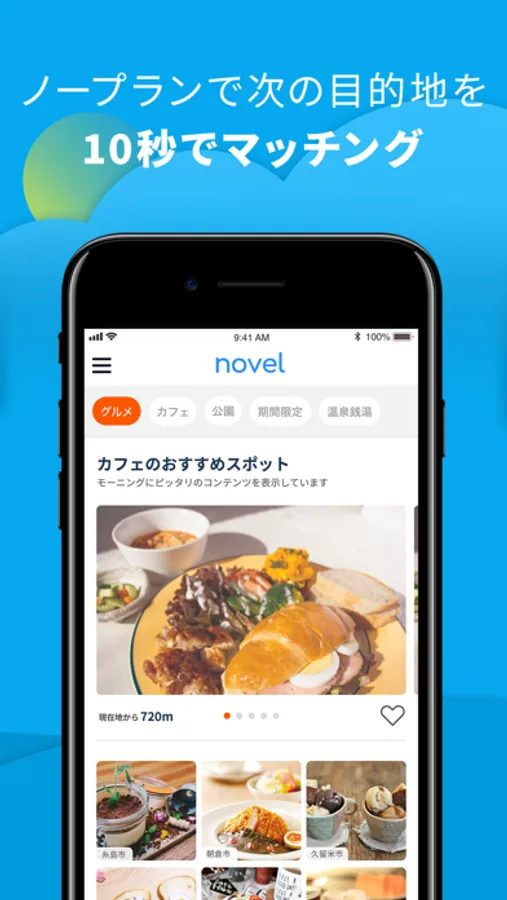 novel(ノベル)は、「ノープラントラベル」の略称で、「あなたのお出かけ先を10秒でマッチング」をコンセプトとしたお出かけ先提案アプリです。ユーザーの現在地や趣味・趣向に合ったあなただけのお出かけ先を提案します。