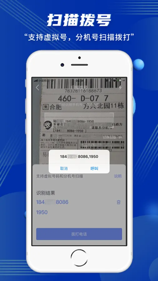 支持扫描虚拟号码和分机号,一次性同时识别虚拟号和分机号,扫描拨打,自动输入分机号,提高工作效率。