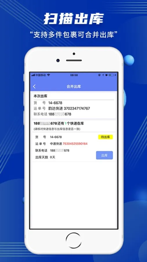 支持运单号、手机号、货号等多种出库方式;多包裹用户可实现多件合并出库。
