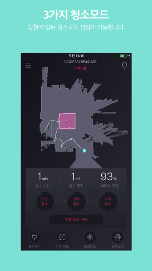 전체, 구역, 스팟 총 3가지의 청소모드를 제공합니다.