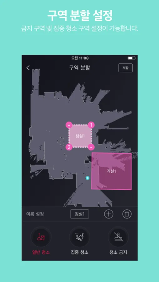 금지 구역 및 집중 청소 구역 등의 설정이 가능합니다.