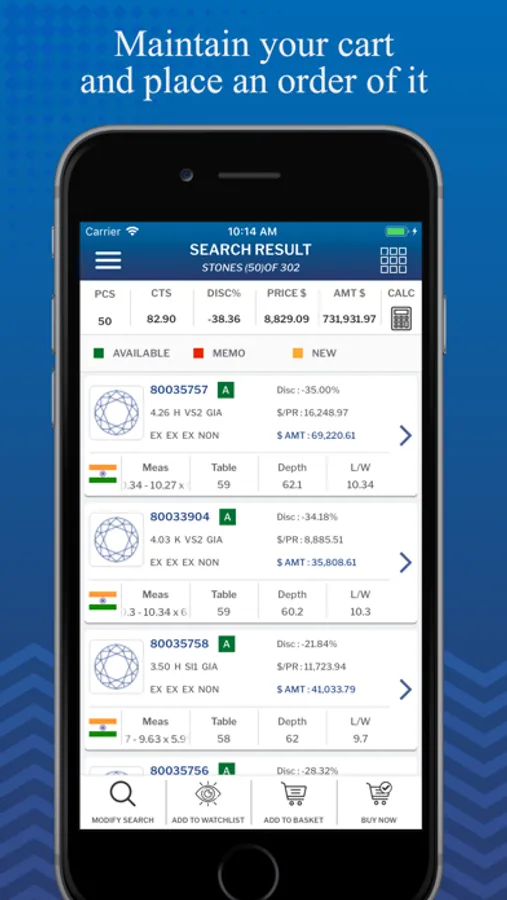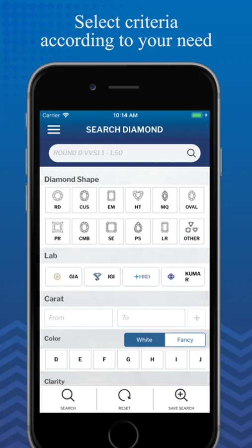 With the Kumar Jewels application, you can quickly and easily find out diamonds. This is a free application for Kumar business user to buy diamonds. Just enter the stone's parameters (carat, clarity, color,) into this simple and user-friendly application and get a full stock list of diamonds.