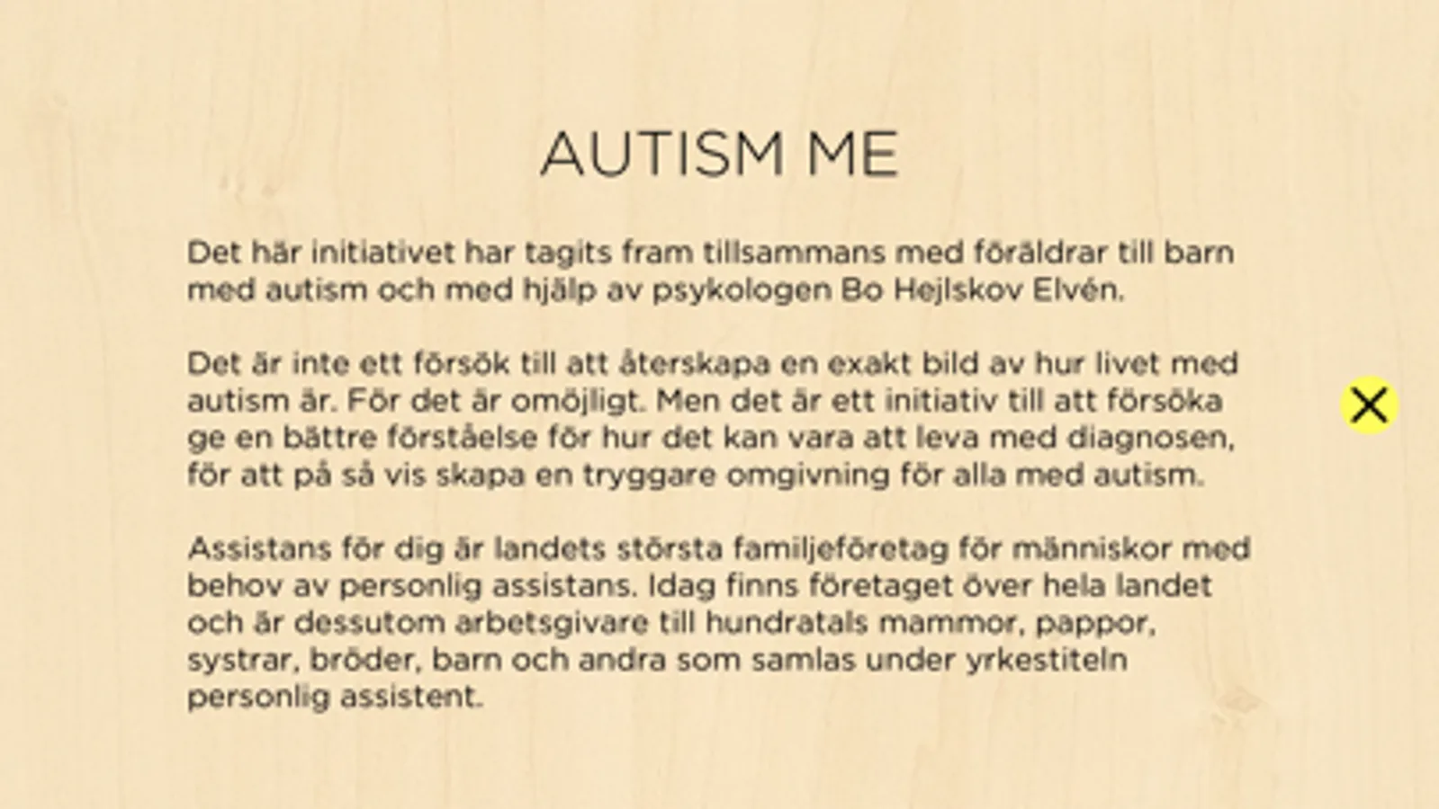 Autism är en diagnos som ingår i autismspektrumet och upplevs helt individuellt. Appen är alltså inte ett försökt till att återge en exakt sanning, för det är omöjligt. Men det är ett initiativ till att ge en bättre förståelse för hur det kan vara att leva med diagnosen. På så vis kan vi skapa en tryggare omgivning för personer med autism.