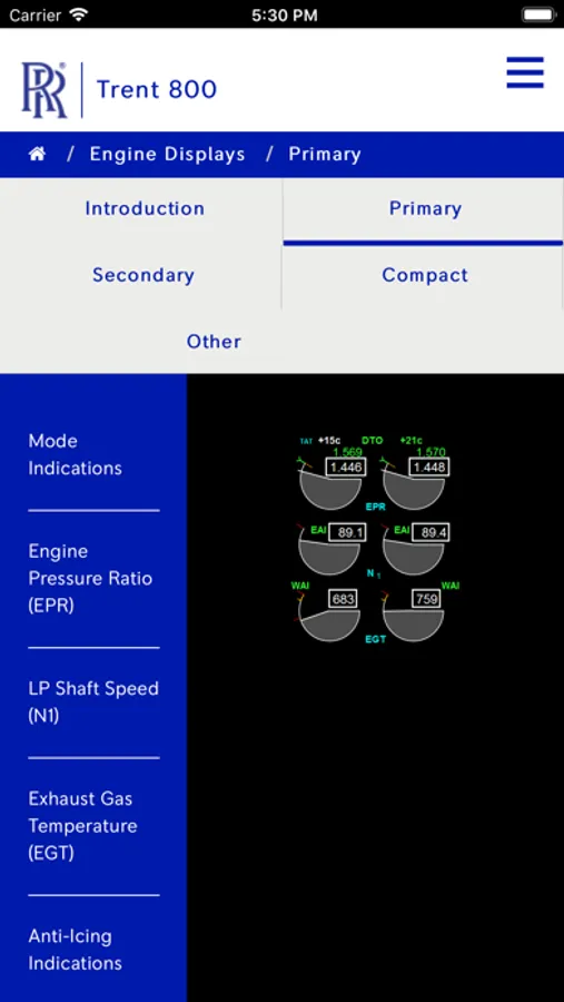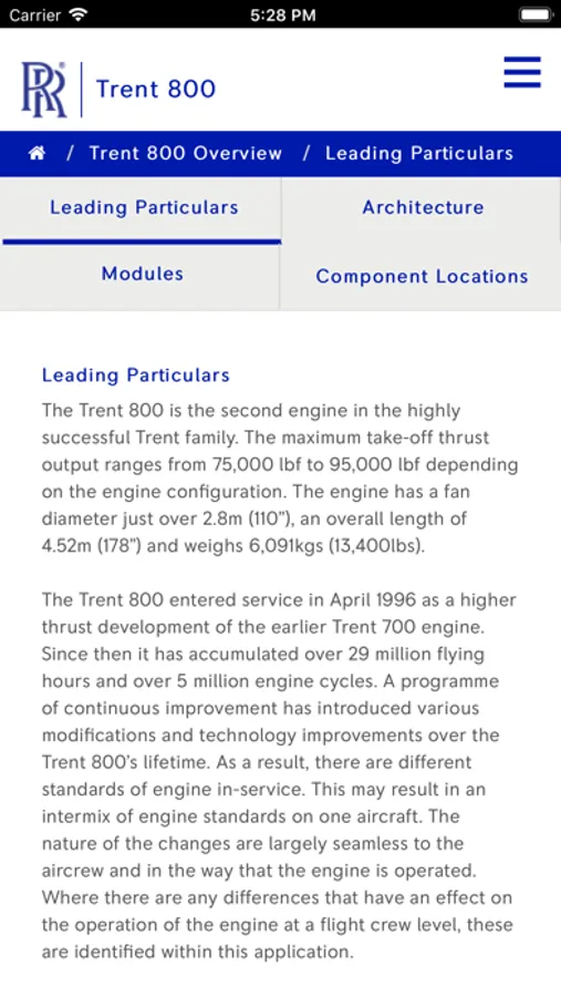 The Rolls-Royce Trent 800 Pilot Guide app is an interactive reference tool for the most popular engine for the Boeing 777 Classic. The app brings together educational material and real engine characteristic data to allow an airline pilot to understand the engine that delivers the power for the Boeing 777 aircraft. This is complemented with the latest Rolls-Royce operational recommendations for the best use of the Trent 800, and the latest understanding on environmental factors that may need to be considered when flying with the engine.