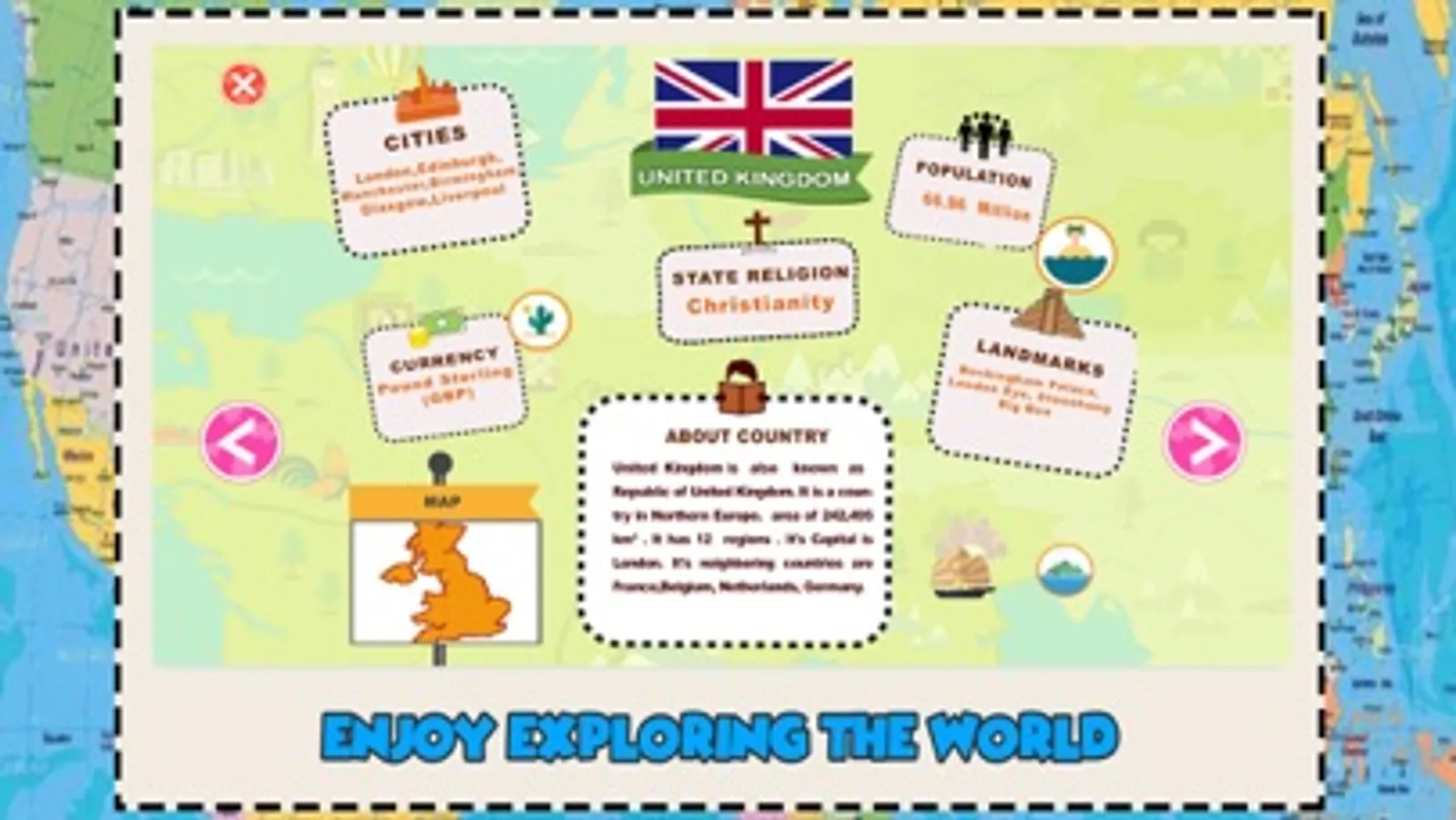 Kids learn about weather,flags, landmarks and famous features, the oceans, and more about different countries. It’s the easiest and best way to get your children enhance their IQ and educational skills. You can download it for free anytime you want and start off (support on all iOS devices iPhone and iPad).