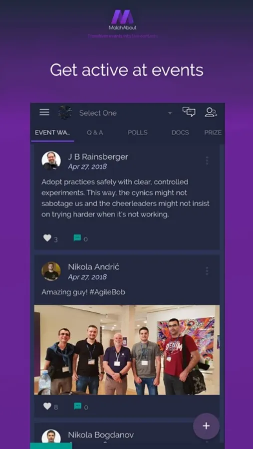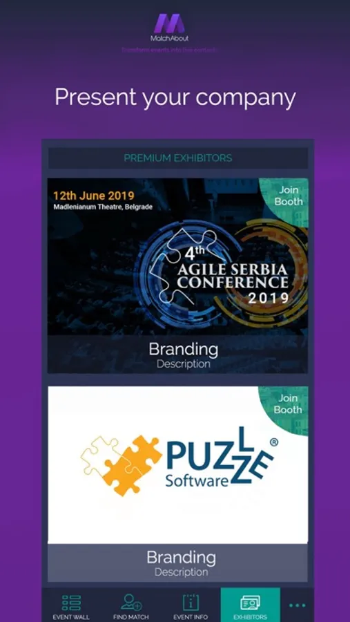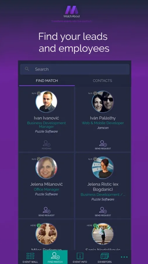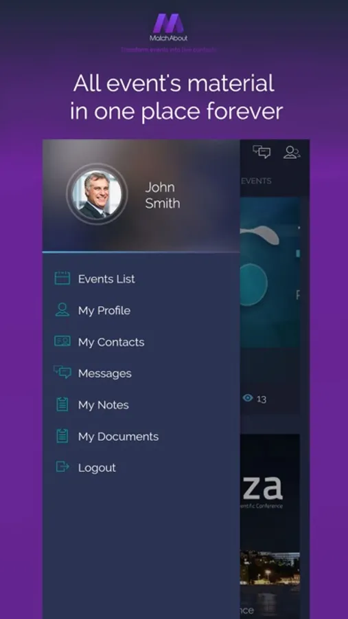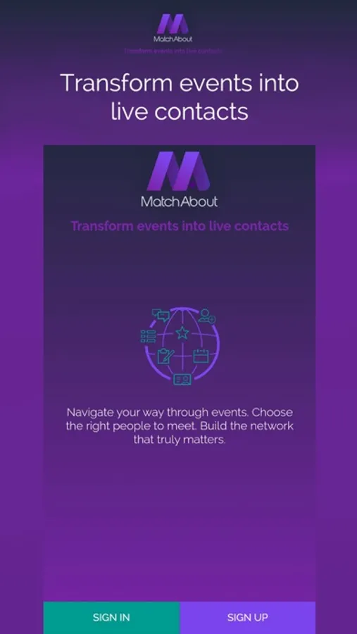 Simple as that! You may log in MatchAbout app by registration, or you can join directly by your LinkedIn or Facebook account. After log in you are on the Event List page and you can see all nearby events. Choose which one of them you prefer to join. When you are log into event you will see Event Info page with all information about event and you will have opportunity to apply with multiply options (post something at the event wall, connect with other people, polls, Q&A..). On the left side of app drop-down list you can do settings of your profile, view your contacts, messages, notes or to log out.