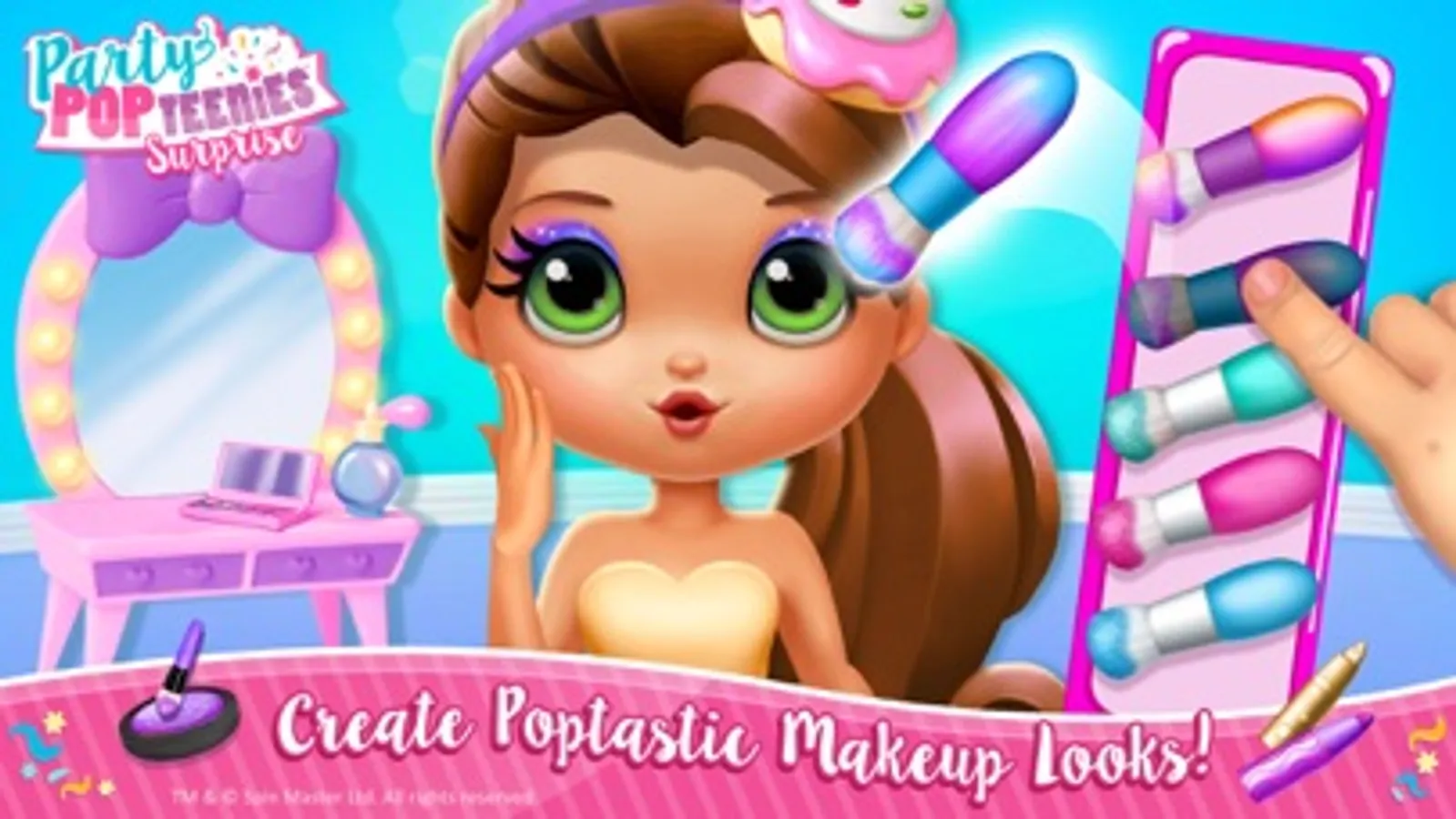 The Popteenies girls love fashion and makeup! Collect all the makeup tools and create poptastic makeup looks! Dress up the girls in the cutest outfits for Popteenies themed parties: Rainbow Unicorn, Cutie Creatures and Winter Wonderland! Rainbow dresses, panda accessories, cupcake hats, unicorn costumes and more!