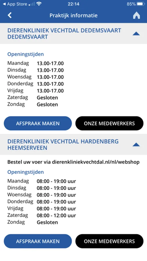 Hiernaast kunt u via de app direct contact met ons opnemen, een afspraak aanvragen, nieuws ontvangen of medicijnen of dieetvoeding bestellen!