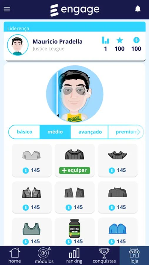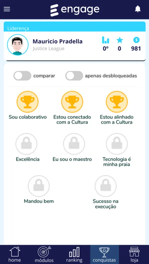 Reconhece e evidencia o comprometimento dos participantes desbloqueando conquistas e disponibilizando prêmios. Além de disponibilizar o acesso aos rankings individual e por equipes com controle de visualização.